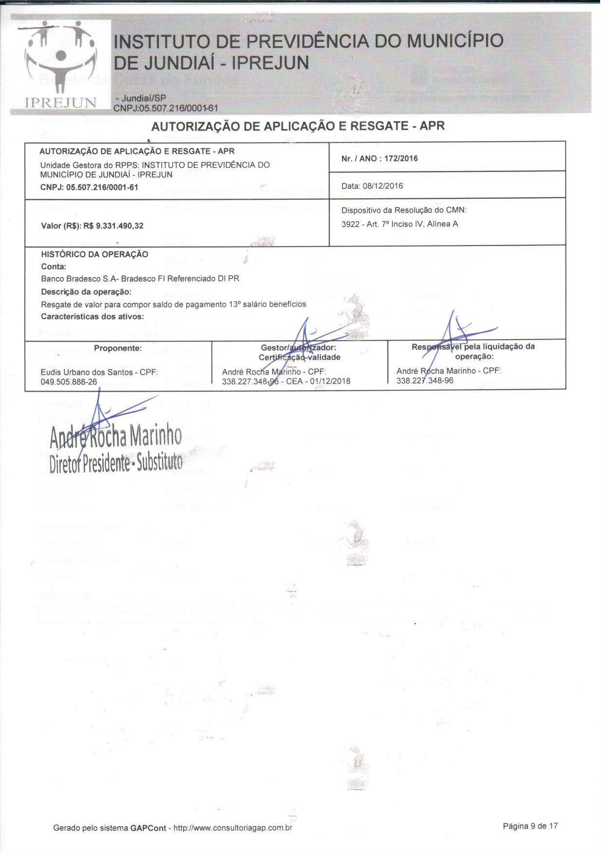| 2016 | 172 | 08/12/2016 | 9.331.490,32 | APR | |